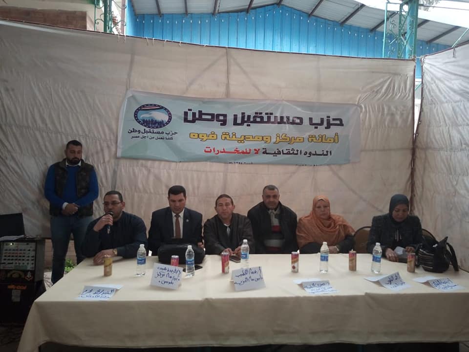 نظم حزب مستقبل وطن برئاسة المهندس اشرف رشادالشريف بمحافظة كفرالشيخ ندوة بمدينة فوة للتعريف بخطورة المخدرات فى إطار مساندة الدولة فى الاهتمام بصحة المواطنين وحاضر فى الندوة الدكتور صبرى الطويلة الاستاذ بجامعة الزقازيق والدكتورة فريدة عبدة أمينة الحزب بمطوبس عن خطورة المخدرات على الصحة العامة وتأثيرها على المجتمع وتحدث الشيخ محمد محرم باوقاف فوة عن حكم الشرع فى التعاطى والاتجار اما المحامية شيماء الحلوانى فتحدثت عن العقوبات القانونية لمتعاطى المخدرات والاتجار فيها وتحدث عصام الخطيب امين حزب مستقبل وطن بمركز فوة عن دور الحزب فى مواجهة تلك الظاهرة وأهمية عقدالندوات ومساعدة المدمنين فى العلاج من خلال السعى لإنشاء مراكز علاج الإدمان وتوفير الاطباء النفسيين لمساعدة المتعاطين فى تهيئة الجو النفسى للعلاج. يأتى ذلك فى إطار خطة الامانة العامة المركزية لمساندة الدولة فى القضاء على الإدمان لبناء جيل صحيح يسهم فى تحقيق التقدم والتنمية