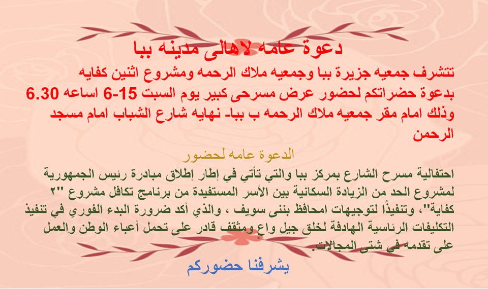 ___________________كتب : عماد الدرمللى تنظم مديرية التضامن الاجتماعي ببنى سويف ، احتفالية مسرح الشارع بمركز ببا - جنوب بنى سويف بالتعاون مع جمعيه تنميه المجتمع المحلى بجزيرة ببا وجمعيه ملاك الرحمه للتنميه بمدينه ببا ، والتي تأتي في إطار إطلاق مبادرة وزارة التضامن الاجتماعى لمشروع الحد من الزيادة السكانية بين الأسر المستفيدة من برنامج تكافل مشروع "٢ كفاية"، وتنفيذًا لتوجيهات السيد المستشار / محافظ بنى سويف لنشر الوعى حول اهميه تنظيم الاسرة وذلك يوم السبت 15-6-2019 بمدينه ببا ( امام جمعيه ملاك الرحمه شارع الشباب بجوار مسجد الرحمن ) وقال وكيل وزارة التضامن الاجتماعي بالمحافظة، إن المبادرة تأتى ضمن خطة الوزارة لتنفيذ عروض مسرحية في إطار كوميدي على مستوى ١٠ محافظات هي الأعلى خصوبة والأكثر فقرًا، حيث تهدف تلك المبادرة لنشر التوعية بين أفراد المجتمع خاصة والأسر بشكل عام من أجل البدء في تنفيذ برامج تنظيم الأسرة وتصحيح المفاهيم الخاطئة.وسوف تضم الاحتفالية فقرة تنورة لجذب انتباه الجمهور بالإضافة لعدد من الفقرات التمثيلية فى إطار كوميدى عن التوعية بأهمية تنظيم السرة وضرورة التعاون الهادف بين الأسر المختلفة والدولة من أجل العمل على تحقيق التنمية الشاملة.هذا وسوف يتم عرض اخر بمدينه اهناسيا بالتعاون مع جمعيه نسيج وجمعيه تنميه المجتمع بسدمنت الجبل يوم السبت الساعه 5 امام مجلس مدينه اهناسيا
