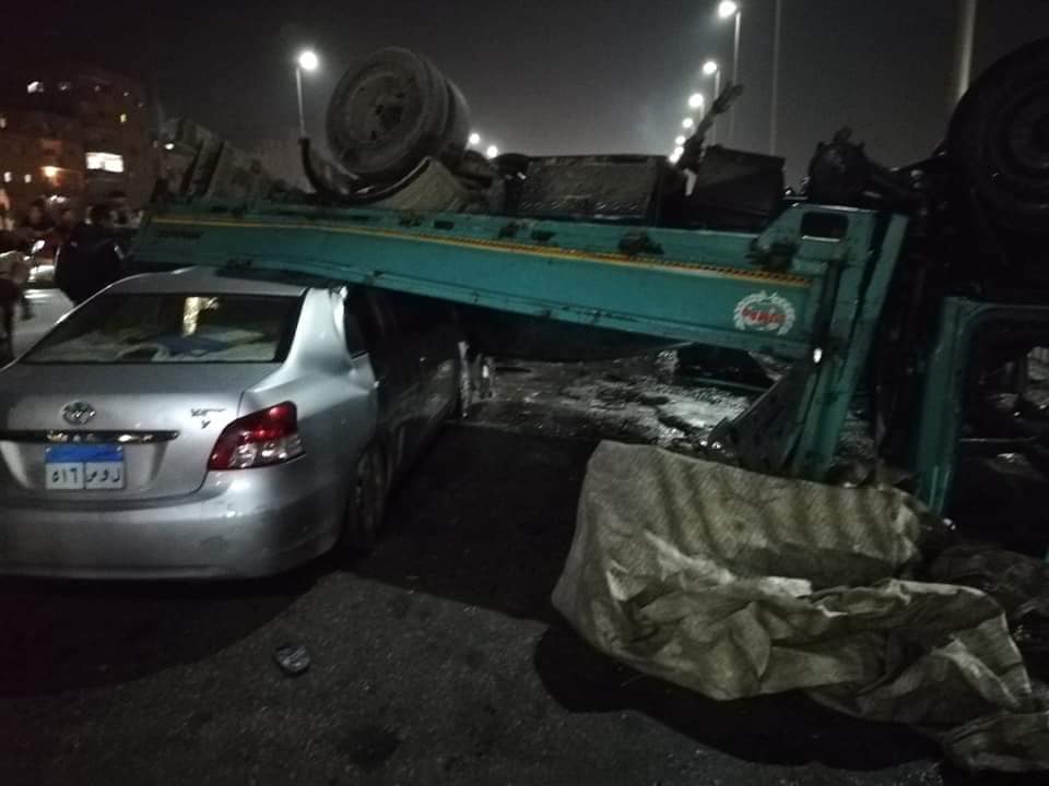 وكانت عمليات مرور القاهرة قد تلقت بلاغا من الأهالى بسقوط سيارة نقل فوق ٤ سيارات ملاكى، على الفور انتقل رجال المرور وفرق الإنقاذ وسيارات الإسعاف إلى مكان البلاغ وتم نقل جثة و٣ مصابين إلى المستشفيات وتم رفع حطام الحادث من نهر الطريق.