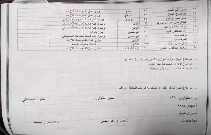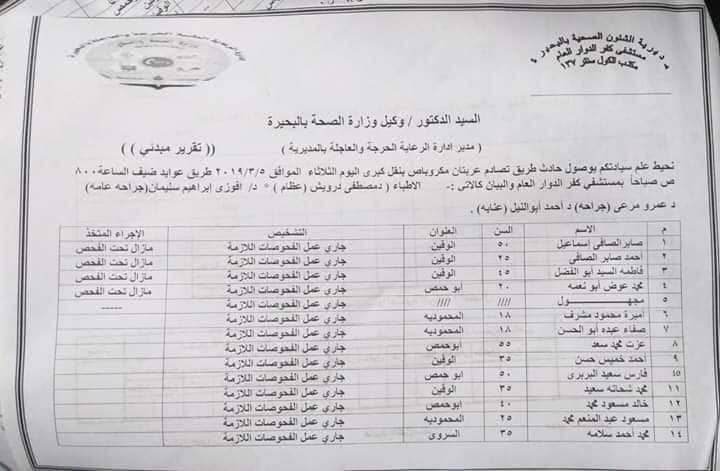 وتم نقل المصابين إلى مستشفى دمنهور التعليمى وكفر الدوار والإسكندرية، والجثث إلى مستشفى كفر الدوار العام.