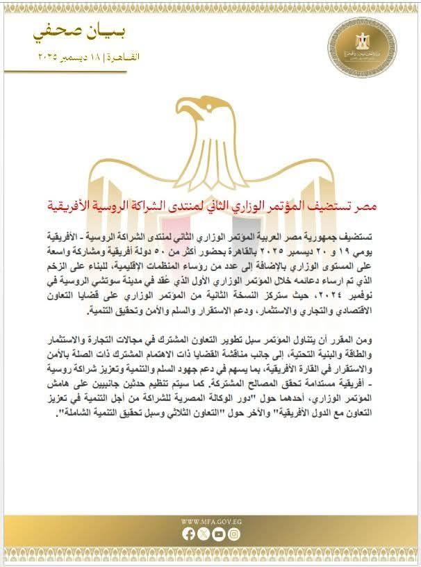 تستضيف جمهورية مصر العربية المؤتمر الوزاري الثاني لمنتدى الشراكة الروسية - الأفريقية يومي ١٩ و ٢٠ ديسمبر ٢٠٢٥ بالقاهرة بحضور أكثر من ٥٠ دولة أفريقية ومشاركة واسعة على المستوى الوزاري بالإضافة إلى عدد من رؤساء المنظمات الإقليمية، للبناء على الزخم الذي تم ارساء دعائمه خلال المؤتمر الوزاري الأول الذي عُقد في مدينة سوتشي الروسية في نوفمبر ٢٠٢٤، حيث ستركز النسخة الثانية من المؤتمر الوزاري على قضايا التعاون الاقتصادي والتجاري والاستثمار، ودعم الاستقرار والسلم والأمن وتحقيق التنمية.