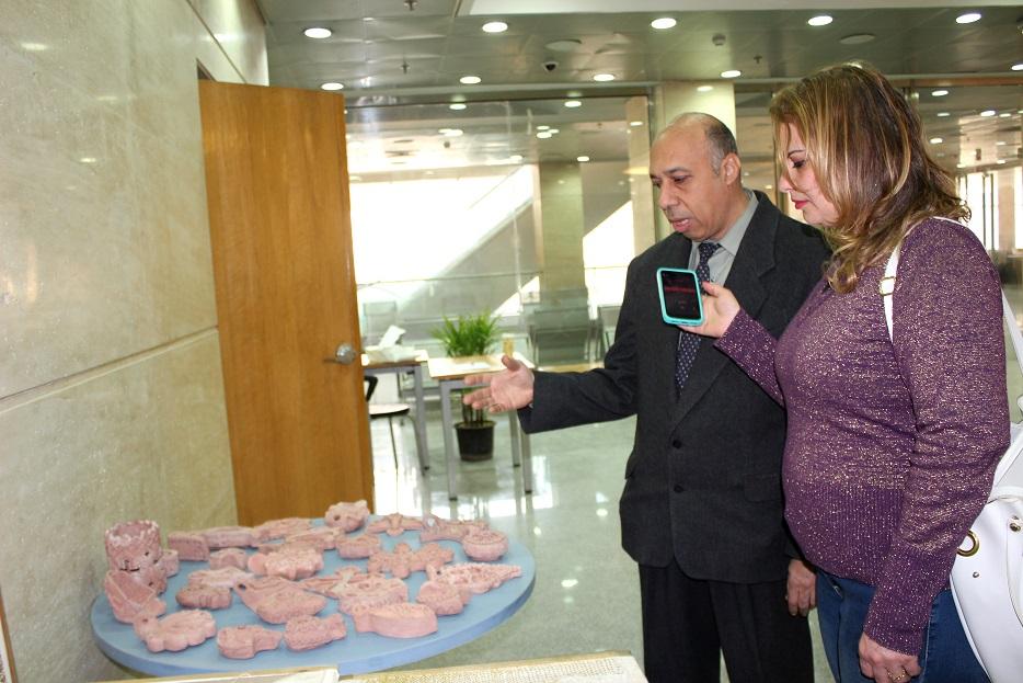 وايضا بالنسبة لاعمال الموزيك بنختار منظر معين قليل التفاصيل ونرسمة تم نختار بعض البلاطات من الموزيك ويتم وضعها على الرسم ولصقها اما بالغراء اذا كانت على خشب او قماش وبالاسمنت اذا كانت على جدار او واجهات وكان الموزيك قديما يصنع من الحجارة او الزجاج وحاليا يصنع من نوعية معينة من البلاستيك ونعرض منها فى هذا المعرض العديد من النماذج
