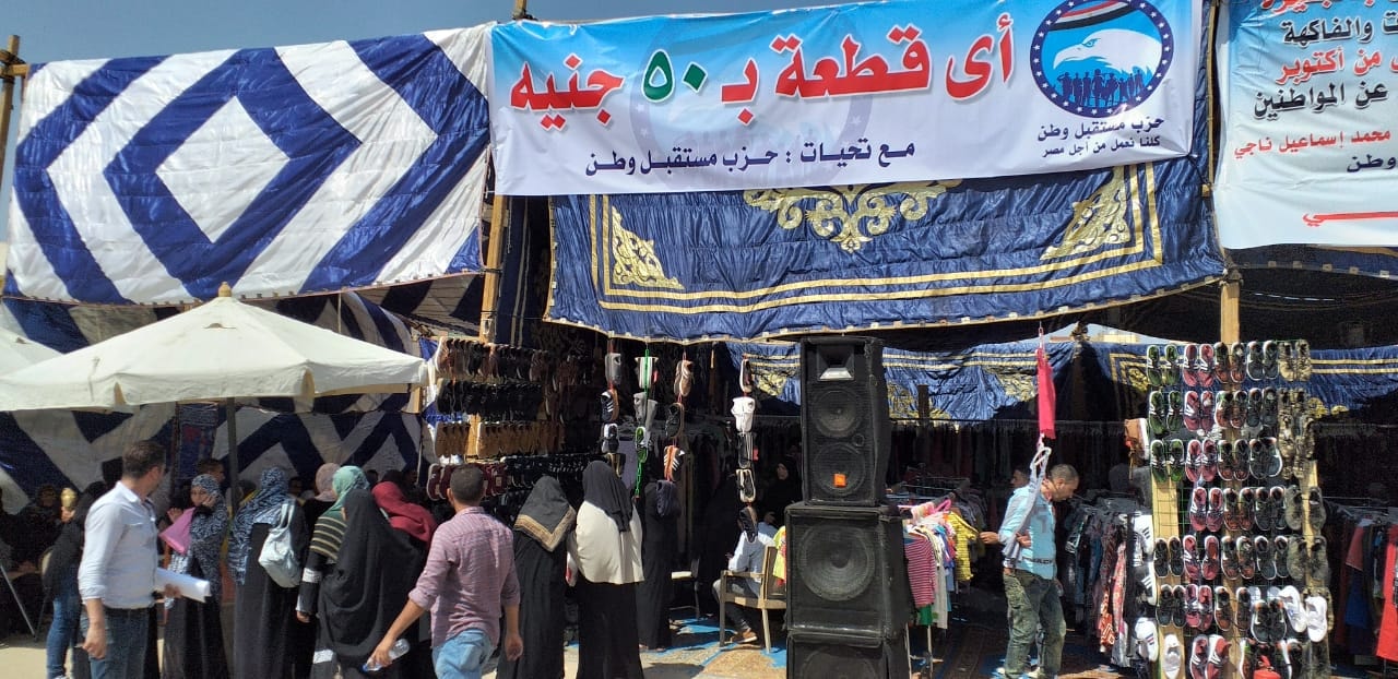 أطلقت أمانة حزب مستقبل وطن بالجيزة تحت رعاية النائب علاء والي أمين الحزب في المحافظة معرضا لبيع الملابس والسلع الغذائية والخضراوات والفواكه بأسعار رمزية.في متناول الجميع