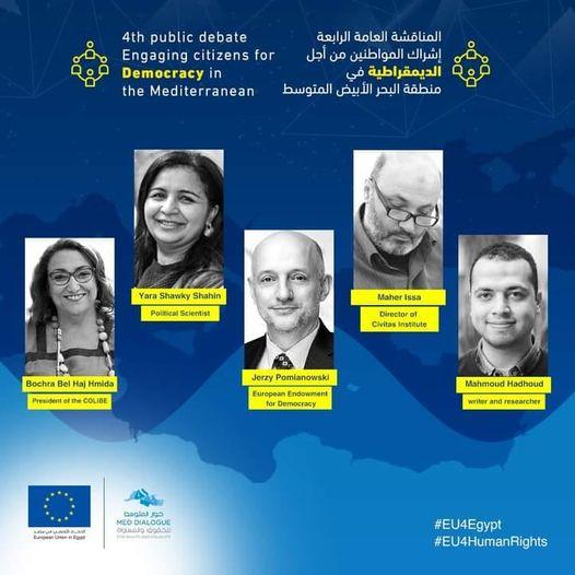 تنظم مفوضية الاتحاد الأوروبي بجمهورية مصر العربية مشروع حوار المتوسط للحقوق والمساواة، والممول من الاتحاد الأوروبي، ودعت لحضور مناقشة إلكترونية بعنوان "إشراك المواطنين من أجل الديمقراطية في منطقة البحر الأبيض المتوسط"، يوم الجمعة 12 مارس 2021 الساعة 6 مساء بتوقيت القاهرة.