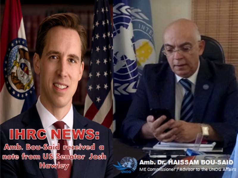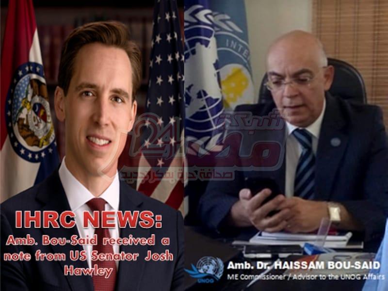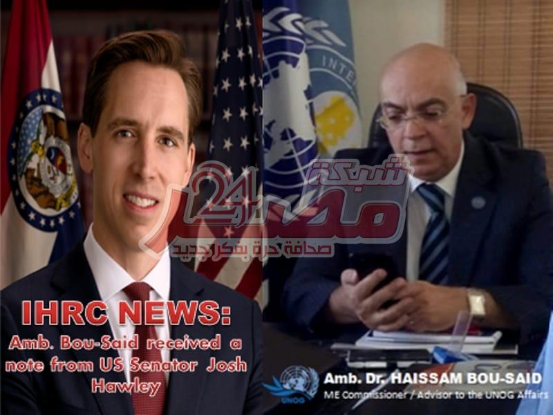 أبرق السناتور بالكونجرس الأمريكي جوش هاولي مفوض الشرق الأوسط للجنة الدولية لحقوق الإنسان ومستشارها لشؤون الأمم المتحدة في جنيف الدكتور هيثم أبو سعيد يوم السبت هنأه بجهوده المبذولة لتبادل المنظور معه حول القضايا المهمة للمجتمع.