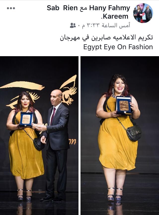 اول امس نشر رجل الاعمال هاني فهمي علي السوشيال ميديا صور لتكريم الاعلاميه وملكة جمال الميديا والممثيله صابرين كريم في مهرجان عيون مصر Egypt egy on fashion وكان مهرجان مشرف وتألقت صابرين كريم بخفة دمها وحضورها ورحها الجميله بين عدد كبير من نجوم الفن وتكرم معها العديد من المع النجوم ومن ضمنهم (الفنان احمد زاهر ،واحمد ابراهيم ،ونرمين ماهر ،ودولي شاهين ،واسامة منير ،روان فؤاد ،والمطرب محمد نور ،عمرو يسري ، مروة عبد المنعم ،امال رزق ، راند البحيري )وكان المهرجان في العديد من الدول المشاركة في الازياء والفاشون العالمية واختتم المهرجان بحفل غنائي مع الفنان المحبوب الي الجماهير محمد نور بصحبة رجل الاعمال هاني فهمي