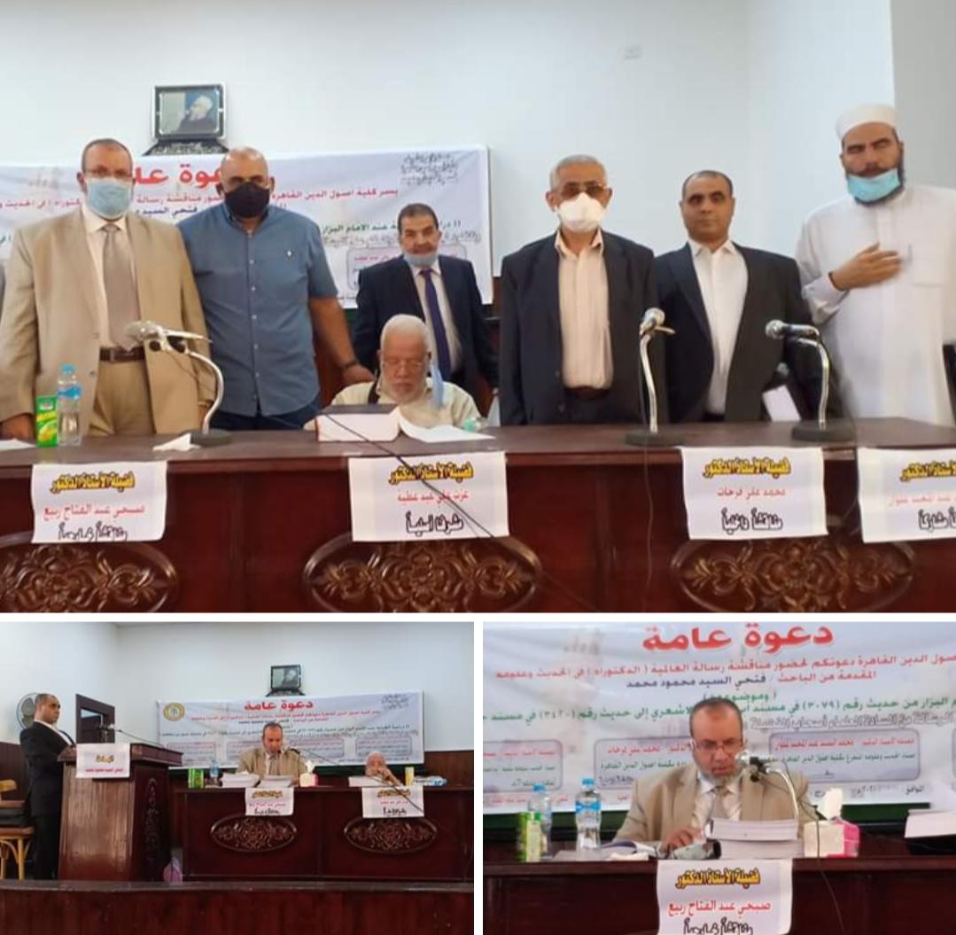 بكليه اصول الدين بالقاهره مناقشه رساله العالميه الدكتوراه في الحديث وعلومه المقدمه من الباحث فتحي السيد محمود محمد وموضوع الرساله دراسه الغرابه عند الامام البزار من حديث رقم ( 3079 )في مسند ابي موسى الاشعري الى حديث رقم 3420 في مسند جبير بن مطعم وتكونت لجنه المناقشه الحكم على الرساله من الساده العلماء اصحاب الفضيله