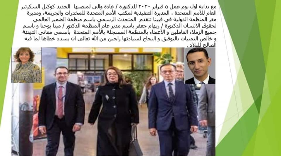 تتقدم الدكتورة . ريهام جعفر المتحدث الرسمي باسم منظمة الضمير العالمي لحقوق الإنسان والمديرة التنفيذية لمكتب الأمم المتحدة للمخدرات والجريمة ومديرة مقر المنظمة الدولية في فيينا باسم الدكتور مينا يوحنا يوسف مدير عام منظمة الضمير العالمي لحقوق الإنسان تتقدم بالتهنئة القلبية للدكتورة . غادة والي علي منصبها الجديد وكيل السكرتير العام للأمم المتحدة الف مليون مبروك لها ولمصرنا الحبيبة وهذا يدل علي مكانة مصر ودور القيادة السياسية وقيمة مصر الدولية مبروك لكل المصريين مع تمنياتنا لها بالتوفيق والنجاح وأن يكلل جهودها وجهود القيادة السياسية في كل المجالات بالنجاح تحت قيادة الرئيس عبد الفتاح السيسي رئيس الجمهورية تحيا مصر تحيا مصر تحيا مصر