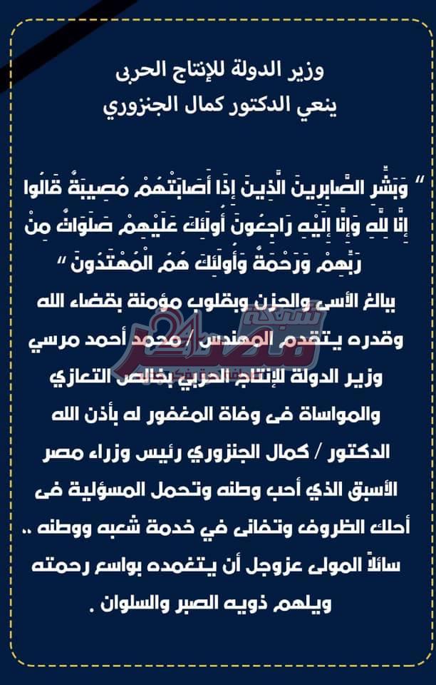 " وزير الدولة للإنتاج الحربى " ينعى...