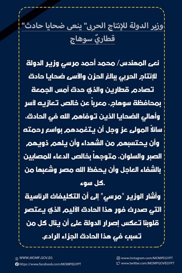 "وزير الدولة للإنتاج الحربى" ينعى ضحايا...