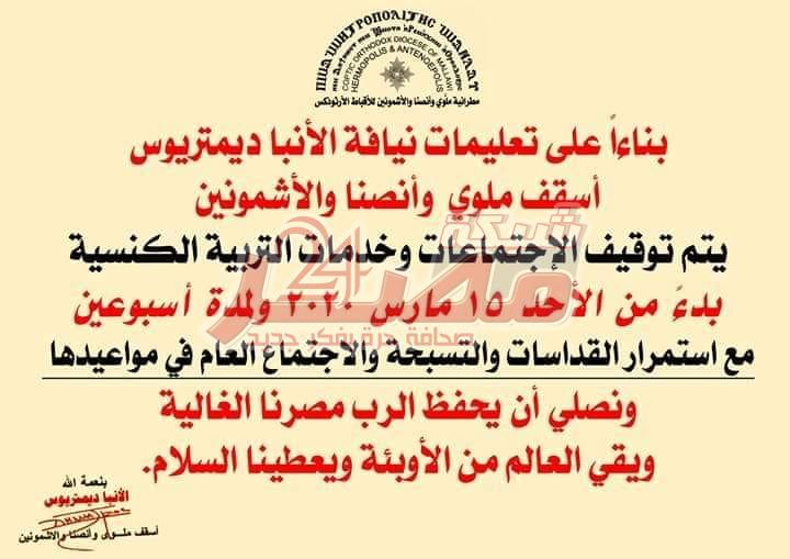الأنبا ديمتريوس يوقف الإجتماعات وخدمات التربية...