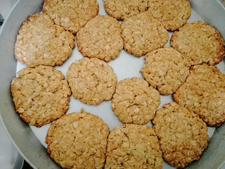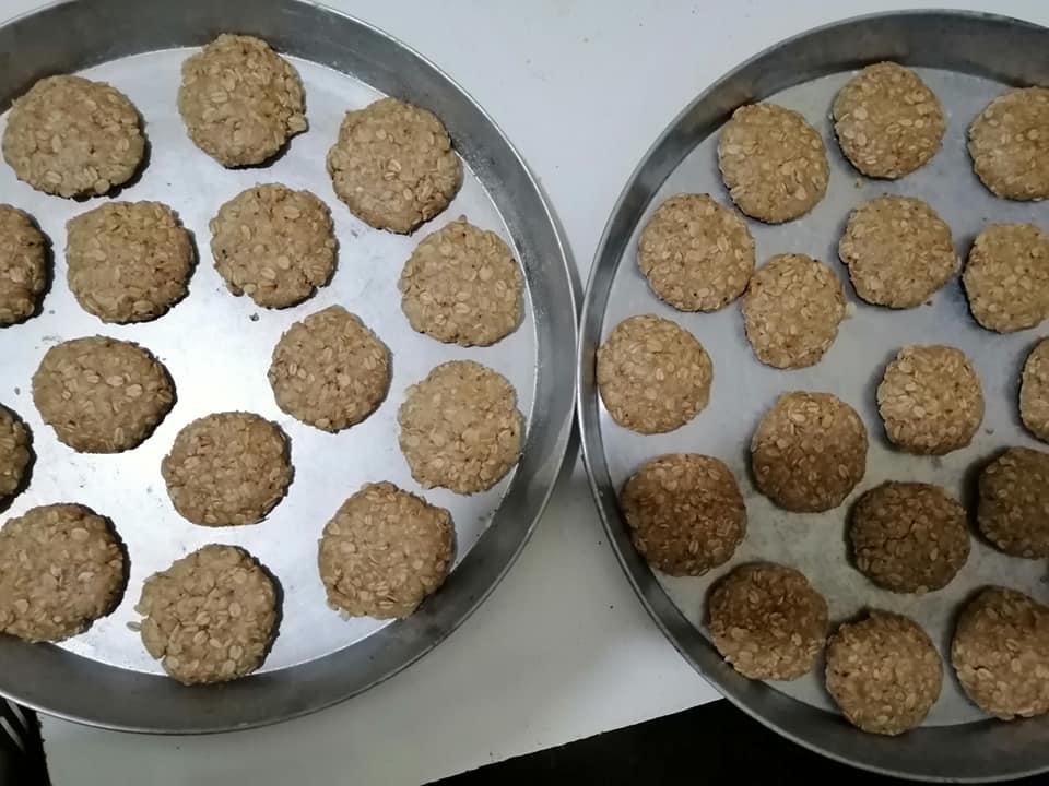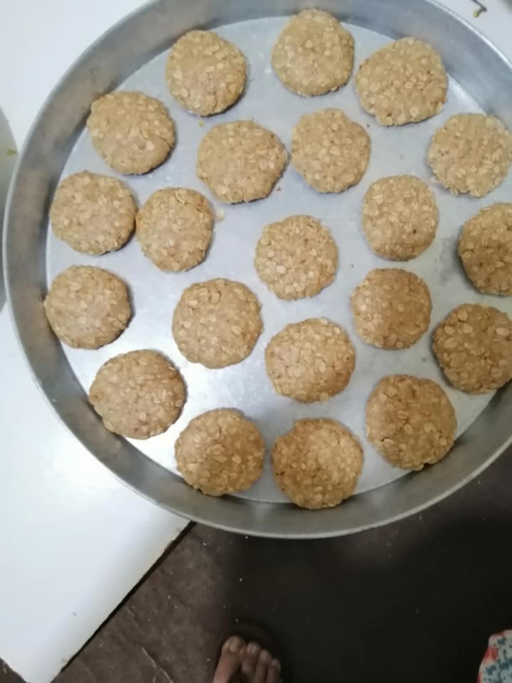 نضع الدقيق مع الشوفان مع البودرة مع الفانليا ونضع البيضه مع الزيت اوالسمن والسكر اوعسل نحل ونخلط كل المقادير على بعضها ونقور ونحط في الصينيه وتدخل الفرن 1/4