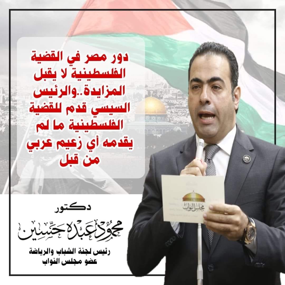 اكد اليوم الكتور محمود حسين رئيس لجنة الشباب والرياضة و نائب محافظة بورسعيد عضو بمجلس النواب من خلال اجتماع مجلس النواب اليوم ان دور مصر من القضية الفلسطينية لا يقبل المزايدة ، والرئيس السيسي قدم للقضية الفلسطينية ما لم يقدمه أي زعيم عربي من قبل