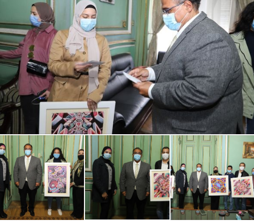استمراراً لفلسفته في دعم وتشجيع الموهوبين من طلاب الجامعة في شتى المجالات ، ألتقى أ. د. عبد الفتاح سعود نائب رئيس جامعة عين شمس لشئون التعليم و الطلاب بمجموعة من طلاب الفرقة الثانية بكلية التربية النوعية ، المشاركون بلوحاتهم في معرض "حوارات لونية وأبعاد ثنائية فى التصميمات الزخرفية" ، وذلك بحضور أ.د. سالي شبل وكيل الكلية لشئون التعليم والطلاب.
