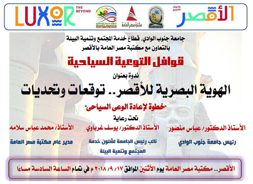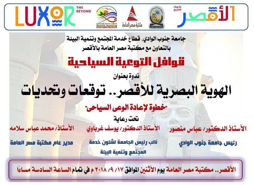 تشهد مكتبة مصر العامة بمحافظة الأقصر بالتعاون مع جامعة جنوب الوادى قطاع خدمة المجتمع وتنمية البيئة إقامة ندوة بعنوان الهوية البصرية للأقصر " توقعات وتحديات" يوم الإثنين المقبل الموافق 17 من سبتمبر الجارى.