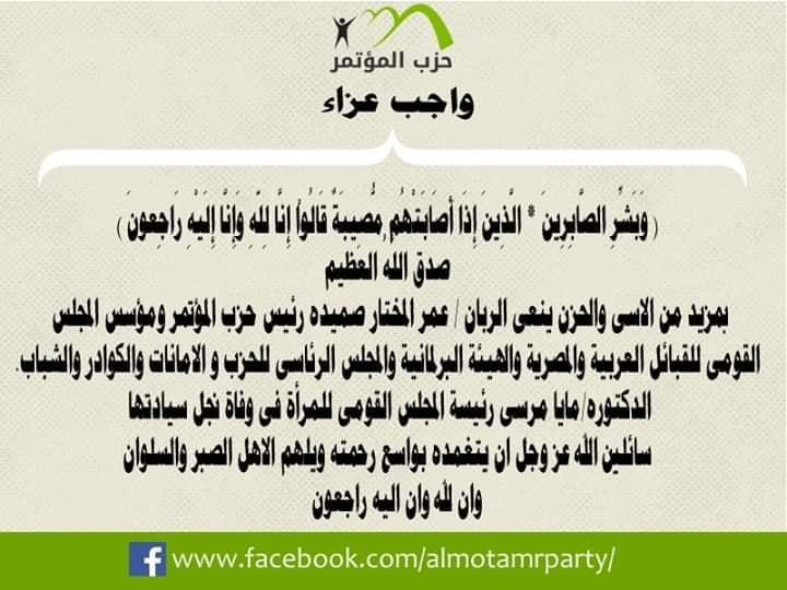بمزيد من الاسى والحزن ينعى الربان / عمر المختار صميده رئيس حزب المؤتمر ومؤسس المجلس القومى للقبائل العربية والمصرية والهيئة البرلمانية والمجلس الرئاسى للحزب و الامانات والكوادر والشباب الدكتوره/مايا مرسى رئيسة المجلس القومى للمرأة فى وفاة نجل سيادتها سائلين الله عز وجل ان يتغمده بواسع رحمته ويلهم الاهل الصبر والسلوان
