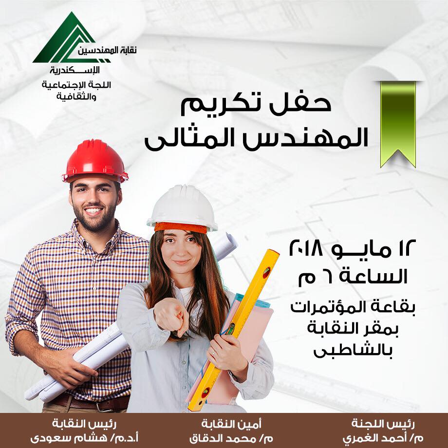 تحت رعاية الأستاذ الدكتور هشام سعودي نقيب مهندسي الاسكندرية تنظم االلجنة الاجتماعية والثقافية بنقابة المهندسين بالإسكندرية برئاسة المهندس احمد الغمري احتفالية كبري بمناسبة عيد العمال عنوان المهندس المثالي وتكرم ثلاثين مهندسا ويتخلل الاحتفالية حفل غنائي يقدمه كورال المؤسسة العربية وذلك يوم السبت الموافق 12 مايو في تمام الساعة السادسة مساءا بمسرح النقابة بالشاطبي