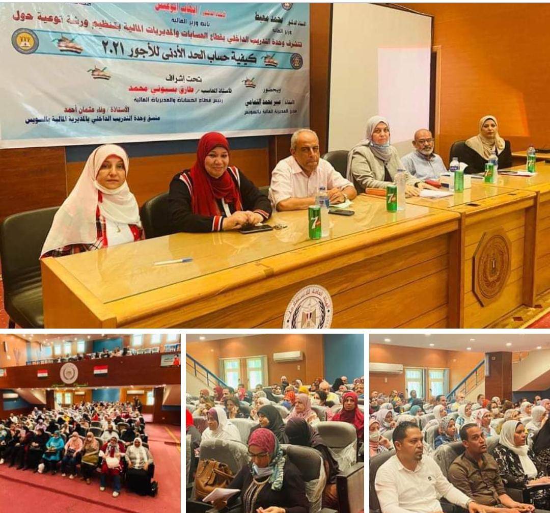 حرصا من الدولة المصرية وفى إطار توجيهات القيادة السياسية بشان تحريك الحد الأدنى للأجور للعاملين بالجهاز الإدارى للدولة لمواكبة التغيير فى الأسعار وتوفير حياة كريمة للعاملين بالجهاز الإدارى للدولة نظمت وحدة التدريب الداخلى بالمديرية المالية بالسويس اليوم الثلاثاء الموافق 10 أغسطس 2021 بمركز النيل للإعلام بالسويس الهيئة العامة للاستعلامات برئاسة ماجدة عشماوى مدير مركز النيل للإعلام بالسويس ورشة عمل حول كيفية حساب الحد الأدنى للأجور ٢٠٢١ وذلك فى ظل توجيهات القيادة السياسية بزيادة الحد الأدنى للأجور وتحت رعاية الأستاذ الدكتور محمد معيط وزير المالية والأستاذ الدكتور إيهاب ابو العيش نائب وزير المالية للخزانة العامة وإشراف طارق بسيونى رئيس قطاع الحسابات والمديريات المالية وحضور كل من السادة عبير محمد التمامى رئيس الإدارة المركزية ومحمود الفولى وكيل أول الوزارة مدير عام التربية والتعليم بالسويس وثروت نزيه مدير عام الوحدات الحسابية ومحمد على مدير عام الوحدات وشيماء فراج ممثل قطاع الحسابات والمديريات وحضر الورشة السادة مندوبى المالية مديرى ووكلاء الحسابات وكلا من السادة مراجعى الباب الأول ومسئولى الاستحقاقات للجهات الإدارية --- وتضمنت الورشة المحاور التالية :--
