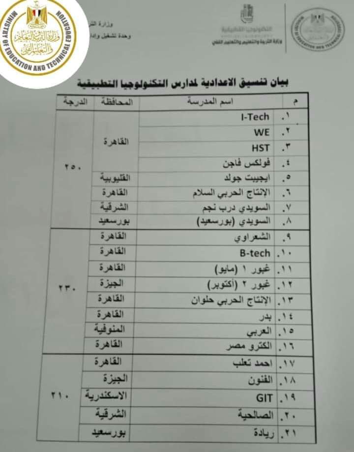 1- مدرسة العربي للتكنولوجيا التطبيقية، يتاح التقديم للبنين من إدارة قويسنا بمحافظة المنوفية وإدارة بنها بمحافظة القليوبية، وأن يكون المتقدم حاصل على مجموع لا يقل عن 230 بالشهادة الإعدادية للعام الدراسي 2020 -2021، وألا يزيد عمره عن 18 عام في أول أكتوبر 2021.