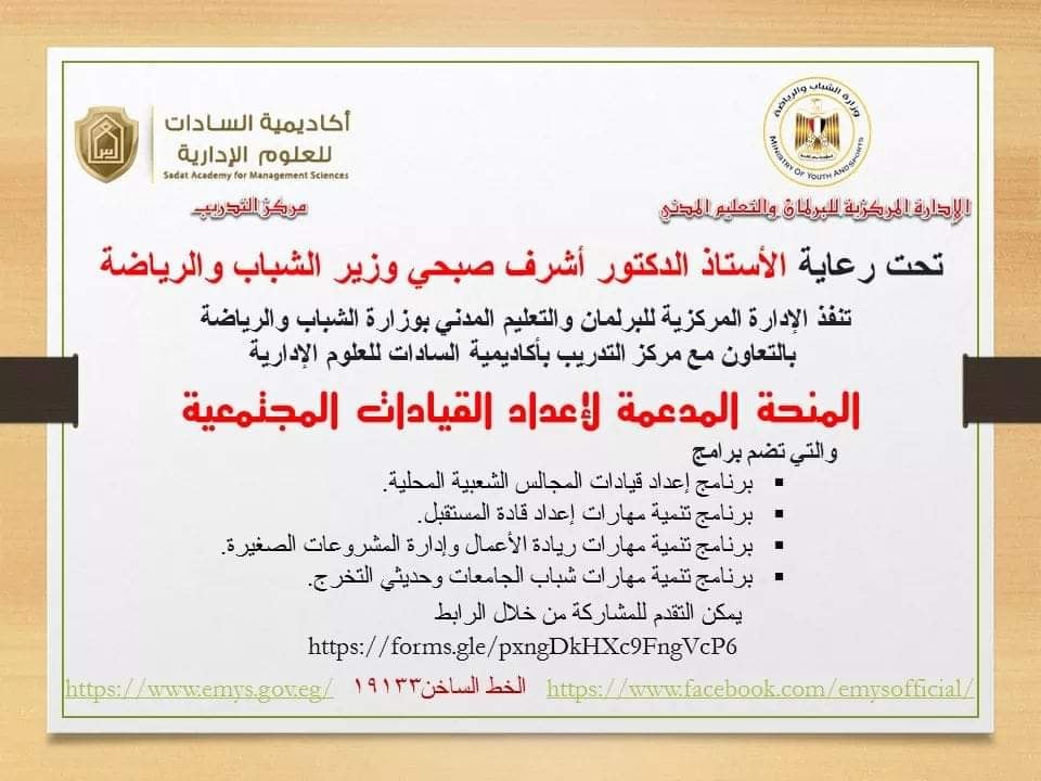 أعلنت وزارة الشباب والرياضة عن إنطلاق المنحة المدعمة لإعداد القيادات المجتمعية بالتعاون مع أكاديمية السادات للعلوم الإدارية خلال الفترة من نوفمبر 2019 حتى مارس 2020 ،وذلك بعد النجاح الذي حققته المنحة في السنوات السابقة منذ 2016 حتى الآن .