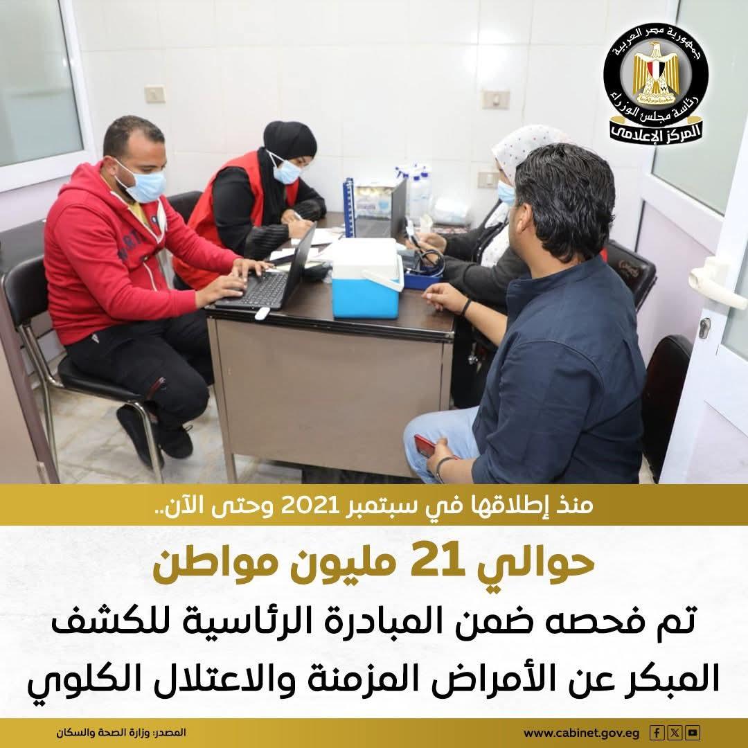 في ضوء التزام الدولة بتوفير رعاية صحية وقائية شاملة ومجانية للمواطنين، أعلنت وزارة الصحة والسكان فحص 20 مليونًا و967 ألفًا و147 مواطنًا على مستوى الجمهورية ضمن المبادرة الرئاسية لفحص وعلاج الأمراض المزمنة والكشف المبكر عن الاعتلال الكلوي، منذ إطلاقها في سبتمبر 2021 وحتى الآن.
