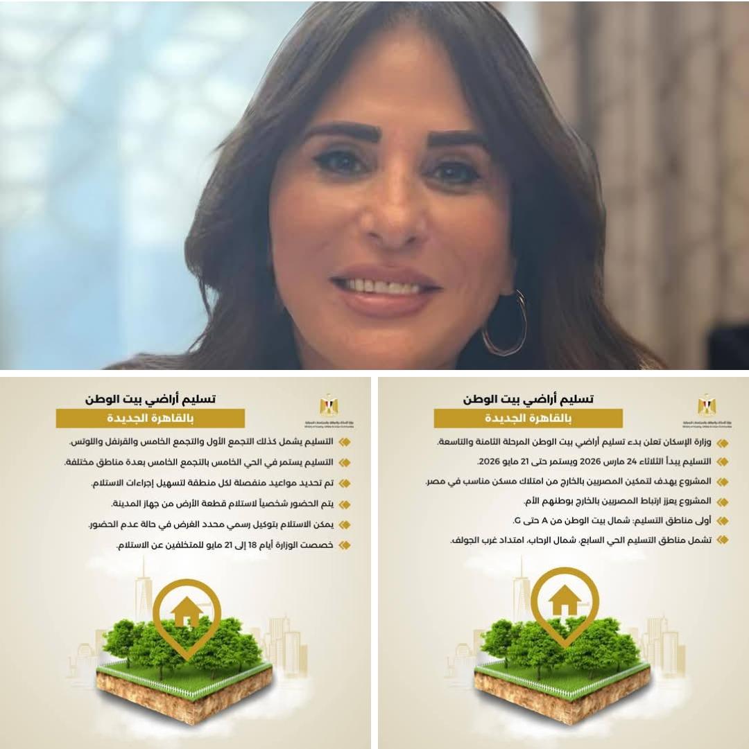 أعلنت المهندسة راندة المنشاوي، وزيرة الإسكان والمرافق والمجتمعات العمرانية، عن تسليم قطع أراضي "بيت الوطن" المرحلة الثامنة والتاسعة للمصريين العاملين بالخارج بعددٍ من المناطق والأحياء بمدينة القاهرة الجديدة، وذلك اعتبارًا من يوم الثلاثاء 24/3/2026، وحتى يوم الخميس 21/5/2026، وفقاً للمواعيد المقررة.