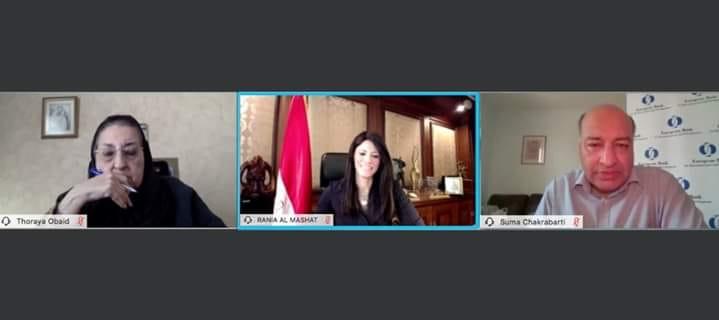 خلال مشاركتها فى ندوة عبر الفيديو كونفرانس مع رئيس البنك الأوروبى لإعادة الإعمار والتنمية ومجموعة العشرين الخاصة بتعزيز دور المرأة بحضور 200 مشارك