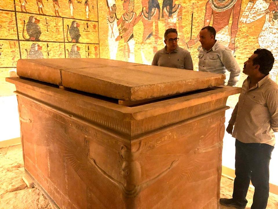 وتوضح صور التابوت وقت اكتشافه خلال القرن الماضي انه كان منقسما إلى جزئين فوق التابوت، قبل وضعه على الأرض بالمقبرة بجوار التابوت منذ عشرات السنين .