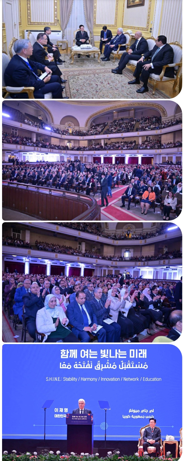الرئيس الكورى يطرح مبادرة S.H.I.N.E لتحقيق السلام والازدهار والثقافة ومستقبل مشرق للشرق الأوسط وشبه جزيرة كوريا لتحقيق الاستقرار، ويعلن عن تقديم منح دراسية للطلاب المصريين للدراسة فى كوريا في مجالات تكنولوجيا المعلومات والاتصال وبرامج التدريب باعتبار الشباب هم قادة المستقبل نحو عالم أفضل.