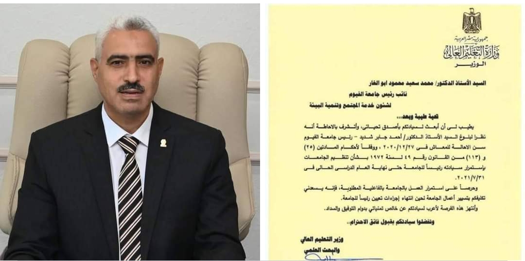 تتقدم أسرة جامعة الفيوم بخالص التهنئة للأستاذ الدكتور محمد سعيد أبو الغار، نائب رئيس الجامعة لشؤون خدمة المجتمع وتنمية البيئة، وذلك لصدور تكليف من الأستاذ الدكتور خالد عبد الغفار، وزير التعليم العالي والبحث العلمي، بقيام أ.د محمد سعيد أبو الغار بتسيير أعمال جامعة الفيوم، متمنين لسيادته مزيدا من التقدم والتوفيق والرقي.