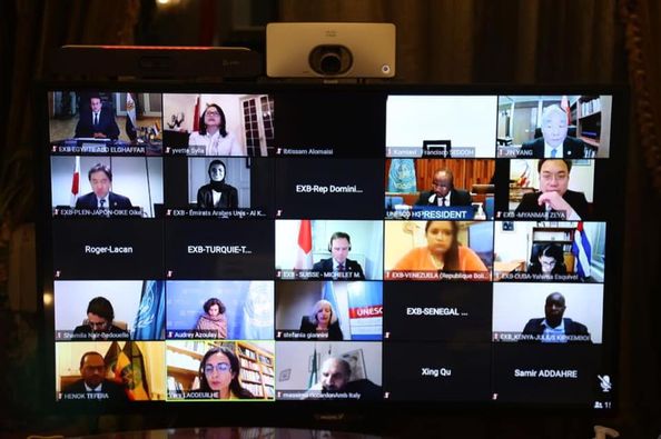 القى الدكتور خالد عبدالغفار وزير التعليم العالي والبحث العلمي، رئيس اللجنة الوطنية المصرية للتربية والعلوم والثقافة، مساء اليوم الأربعاء، كلمة مصر في الدورة (210) للمجلس التنفيذي لمنظمة اليونسكو عبر تقنية الفيديو كونفرانس، بمشاركة السيدة أودري أزولاي المدير العام لليونسكو، السفير أجابيتو مباموكي رئيس المجلس التنفيذي لليونسكو، والسفير إيهاب بدوي المندوب الدائم لمصر لدى اليونسكو، والدكتورة غادة عبدالباري الأمين العام للجنة الوطنية المصرية للتربية والعلوم والثقافة.