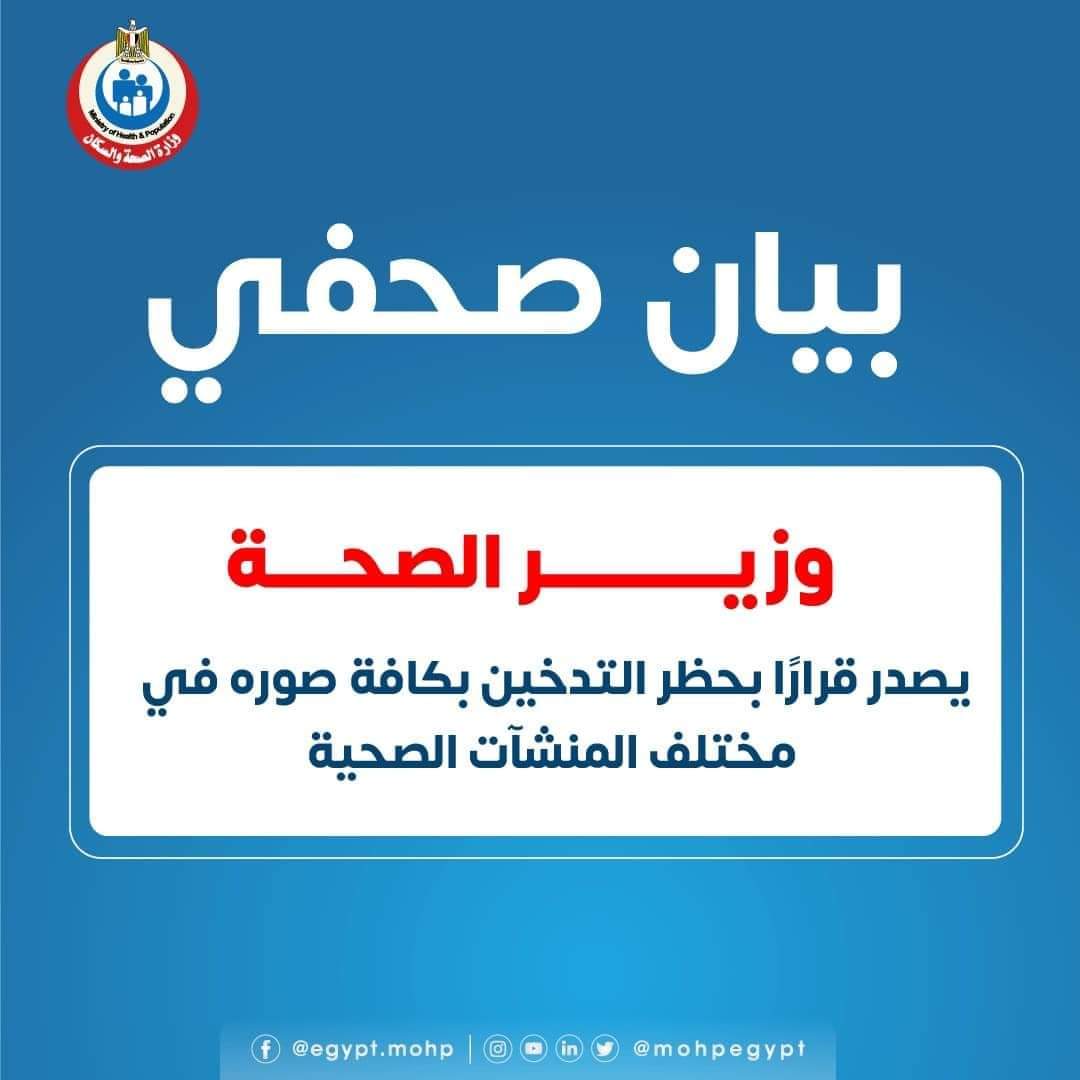 اصدر الدكتور خالد عبدالغفار، وزير الصحة والسكان، قرارًا بحظر التدخين نهائيًا بكافة صوره في مختلف المنشآت الصحية سواء التى تقدم خدمات علاجية أو وقائية أو تأهيلية، وذلك فى إطار الحفاظ على صحة وسلامة المواطنين من المخاطر الصحية للتدخين.