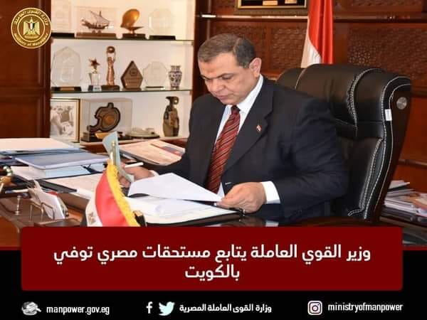 أصدَر وزير القوى العاملة محمد سعفان، تعليمات لمكتب التمثيل العمالي التابع للوزارة بالسفارة المصرية بالكويت بمتابعة المستحقات العمالية، والديه الشرعية التى يتحملها الجاني عن قتل علي محمد اليمني حسن ، إثر مشاجرة نشبت بينهما وهما يعملان في الكويت، وأعرب الوزير عن خالص تعازيه لأسرة المتوفي وأن يلهمهم الله الصبر والسلوان، والتواصل مع ذويهم بالتنسيق مع القنصلية المصرية لمتابعة التحقيقات وإنهاء نقل جثمان المتوفى للقاهرة.
