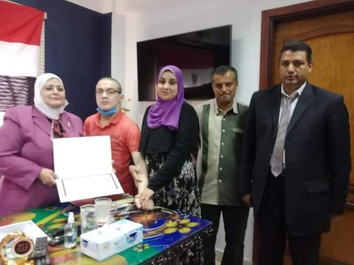 وفى نهاية الحوار تنبات الدكتورة بثينة كشك وكيل وزارة التربية والتعليم ان هذا الطالب سيكون له مكانة علمية يوما ما وقدمت له كتاب الله العزيز مصحوبا بشهادة تقدير واشارت إلى اعتزازها بما قدمه الوالدان من جهد ومثابرة وحرصت على التقاط الصور التذكارية معهم تقديرا لمحمد