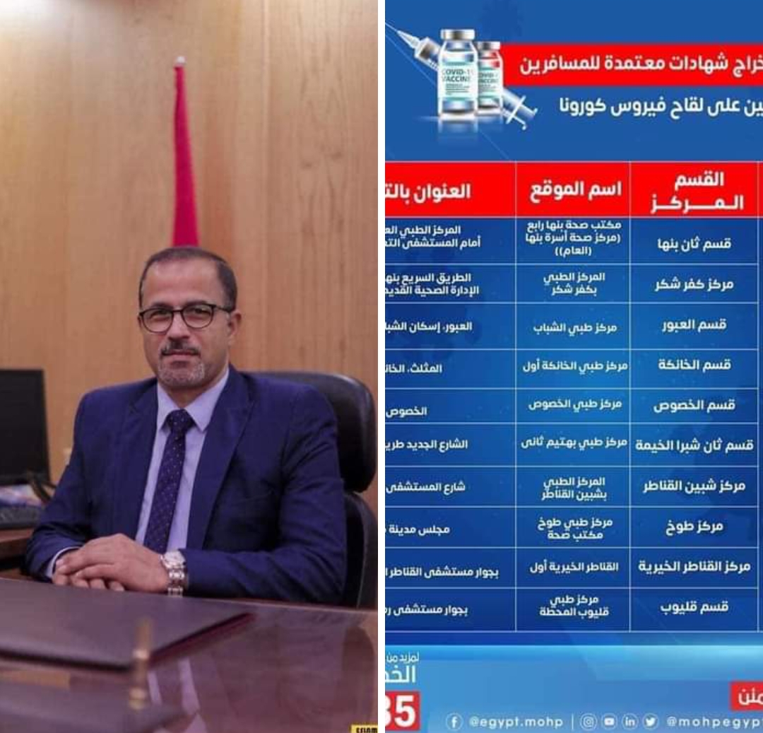 وتنفيذاً لتعليمات وتوجيهات الدكتوره هاله زايد وزيرة الصحة والسكان واللواء عبدالحميد الهجان محافظ القليوبية بتسهيل إجراءات تطعيم لقاح ضد فيروس كورونا المستجد علي المواطنين المسافرين الى الخارج