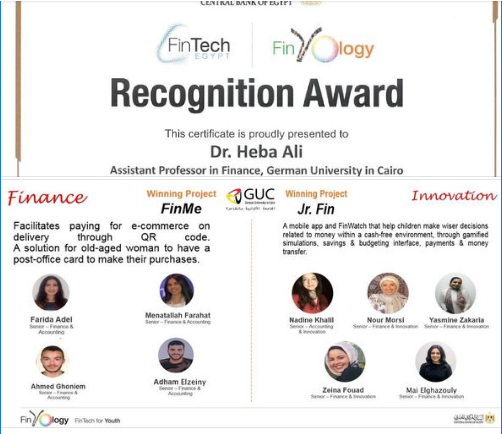 شارك مجموعة من طلبة قسمي التمويل ، و الأبتكار و ريادة الأعمال بكلية تكنولوجيا الأدارة بالجامعة الألمانية بالقاهرة في مبادرة FinYology-FinTech for Youth التي أطلقها البنك المركزي المصري وتسعى لنشر الوعي و تنمية الابتكار في مجالات وتطبيقات التكنولوجيا المالية وتتواكب مع جهود الدولة المبذولة لتحقيق أهداف الشمول المالي والتحول الرقمي ، وذلك بالتعاون مع عدد من البنوك - شملت الأهلي المصري، بنك مصر، الإمارات دبي الوطني، قطر الوطني، الإسكندرية – و شارك فيها عدد من الجامعات – منها الأمريكية بالقاهرة ، الجيزة الجديدة ، الأكاديمية العربية للعلوم والتكنولوجيا والنقل البحري إضافة للجامعة الألمانية بالقاهرة ، حيث بدأت المبادرة بمسابقة تنافسية شارك فيها عدد206 طالب وطالبة بالسنة الدراسية الرابعة بقسمى التمويل ، و الابتكار وريادة الاعمال ، وتم تكليفهم بإعداد مشروعات بحثية حول مجالات و تطبيقات التكنولوجيا المالية ، كما حوى برنامج المبادرة تقديم محاضرة متخصصة جاءت فى إطار نشر الوعى بمفهوم التكنولوجيا المالية من جانب الدكتورة رشا نجم - وكيل المحافظ المساعد لقطاع نظم الدفع وتكنولوجيا المعلومات بالبنك المركزى.
