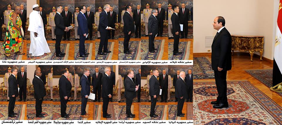 تسلّم السيد الرئيس/ عبد الفتاح السيسي اليوم أوراق اعتماد ستة عشر سفيراً جديداً هم: السيد/ تشاينارونج كيراتيوتفونج سفير تايلاند، والسيد/ رافائيل فينتيميا شيريبوجا سفير الإكوادور، والسيد/ أرمان إساغالييف سفير كازاخستان، والسيد/ إدواردو أنطونيو فاريلا سفير الأرجنتين، والسيد/ ستيفان روماتيه سفير فرنسا، والسيد/ بول جارنييه سفير سويسرا، والسيد/ زادا ماهامان بشير سفير النيجر، والسيد/ بول أوكووه سفير غانا، والسيد/ توميسلاف بوسنجاك سفير كرواتيا، والسيد/ يان ثيسلف سفير السويد، والسيد/ شون اوريجن سفير أيرلندا، والسيد/ جيامباولو كانتينى سفير إيطاليا، والسيد/ جيس داتون سفير كندا، والسيد/ لويس راؤل لوبيث سفير جواتيمالا، والسيد/ عطاء أفندي سفير جمهورية القمر المتحدة، والسيد/ شاريوف أوراز محمد آتاجانوفيش سفير تركمانستان.