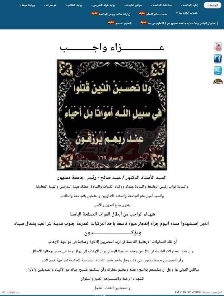 جامعة دمنهور تنعي شهداء القوات المسلحة ببئر العبد