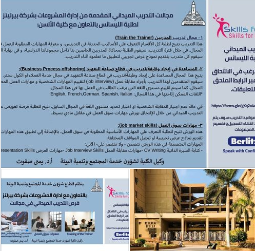 أعلن قطاع خدمة المجتمع وتنمية البيئة بكلية الألسن جامعة عين شمس، فتح باب التسجيل في فعاليات التدريب الميدانى بالتعاون مع شركة بيرليتز، تحت رعاية أ.د.محمود المتيني رئيس الجامعة، أ.د.نظمى عبد الحميد نائب رئيس الجامعة لشئون خدمة المجتمع وتنمية البيئة، أ.د.سلوى رشاد عميد الكلية، و إشراف أ.د.يمنى صفوت وكيل الكلية لشئون خدمة المجتمع وتنمية البيئة، على أن يكون التدريب أونلاين عن طريق برنامج zoom.