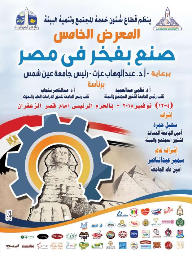 وأضاف "عبدالناصر" في تصريحات صحفية، أن قطاع شئون خدمة المجتمع وتنمية البيئة بجامعة عين شمس، سينظم مطلع شهر نوفمبر المقبل معرض "صنع بفخر في مصر"، والذي يقام في دورته الخامسة، بمشاركة 39 شركة من الشركات العاملة في العديد من الصناعات الوطنية، مثل صناعة الأغذية والجلود والغزل والنسيج وغيرها من المنتجات، وذلك بهدف تشجيع الصناعة الوطنية ودعم الاقتصاد المصري.