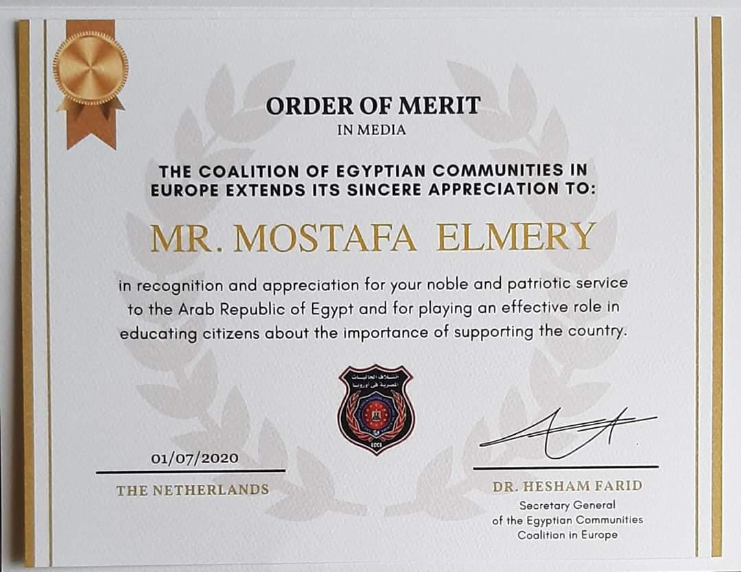 كرم الدكتور هشام فريد رئيس اتحاد المصريين في أوروبا الاعلامي مصطفي الميري نظرا لمجهوداته وتميزه في توصيل رساله سامية وتعاونه البناء لحل بعض المشاكل العامة والخاصة