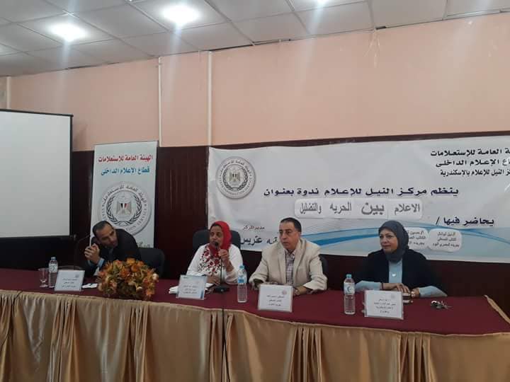 نظم مركز النيل للإعلام بالإسكندرية ندوة بعنوان "الاعلام بين الحرية والتضليل" بقاعة مبنى مجمع إعلام الجمرك بمنطقة الأنفوشى ، حاضرها الصحفى حسين ثابت بجريد الأهرام والصحفى نبيل أبوشال بجريدة المصرى اليوم والأستاذة/ شوقية عبدالوهاب مدير مركز النيل للإعلام والأستاذة/ عزة ماهر مدير عام الإدارة العامة لاعلام الاسكندرية ومطروح ، بمشاركة التوجيه العام للصحافة بتعليم الإسكندرية بقيادة الأستاذة /هيام رياض ممثلة عنها الأستاذة/ ماجدة عبدالستار موجه أول الصحافة بتعليم غرب الإسكندرية وعدد من موجهى وأخصائى الصحافة والإعلام وموظفى وزارة الزراعة وطلاب معهد الخدمة الإجتماعية.