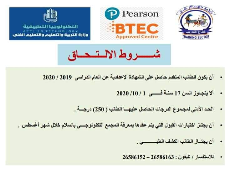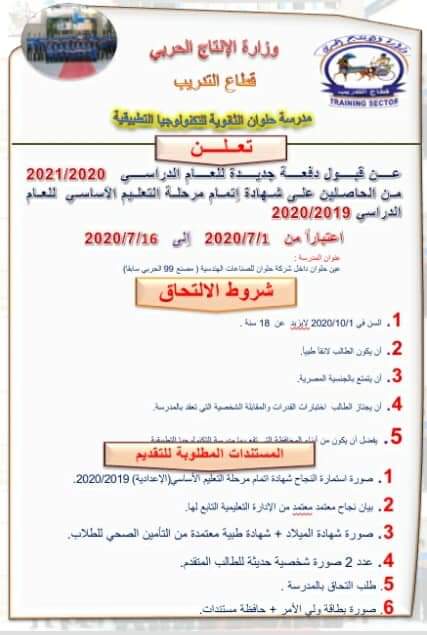 يعلن قطاع التدريب التابع لوزارة الإنتاج الحربى عن فتح باب التقدم لمدرسة السلام الثانوية للتكنولوجيا التطبيقية وذلك للطلاب الحاصلين على الشهادة الإعدادية من وزارة التربية والتعليم الفنى.