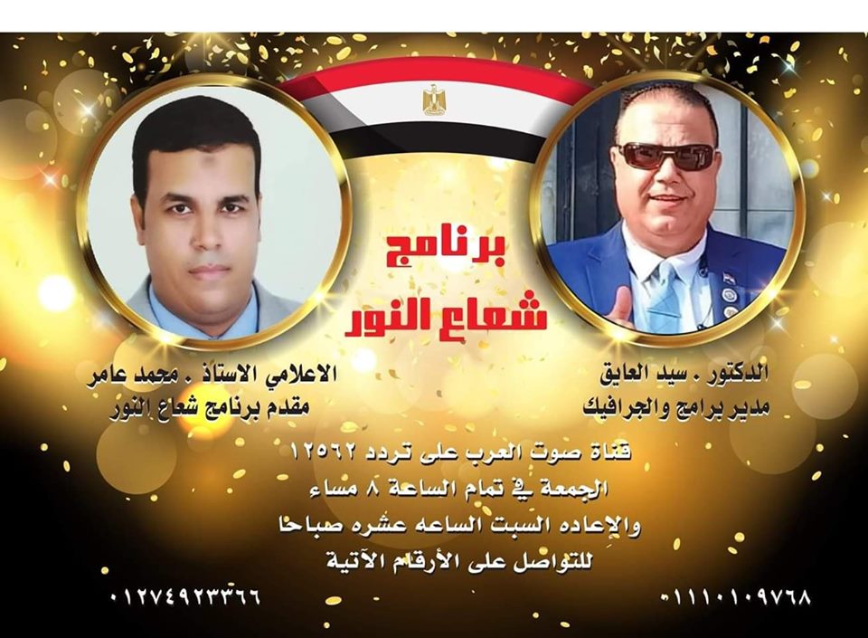 للزميل الاعلامي المحترم محمد عامر بمناسبه اول حلقه للبرنامج شعاع النور على قناه صوت العرب يوم الجمعه في تمام الساعه 8 مساء ننتظركم الاعادة ١٠ صباحاً السبت على صوت العرب الثانيه