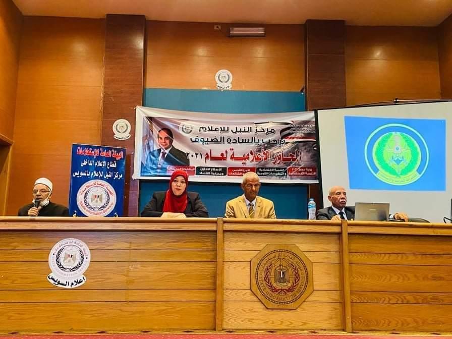 احتفالا بأعياد نصر أكتوبر 1973 والعيد القومى للسويس للعام 48 وانتصار الإرادة والعزيمة والبطولة والفداء والتضحية على القوى الغشيمة والمحتلة لأرض سيناء العظيمة وأفشال مخططات العدو الغاشم ودحره وهزيمته وطرده من السويس ومن كامل التراب المصرى ومشاركتا من إعلام الدولة المصرية الجديدة والحديثة فى هذا الحدث التاريخى المجيد قام اليوم الإثنين الموافق 25 أكتوبر مركز النيل للإعلام الهيئة العامة للاستعلامات بالسويس برئاسة ماجدة عشماوى احتفاليه بأعياد اكتوبر المجيدة والعيد القومى للسويس ال48"بندوة تثقيفية حول تحديات الأمن القومى حاضر فيها اللواء أركان حرب ناجى شهود الخبير الإستراتيجي بأكاديمية ناصر العسكرية وبحضور السادة النواب أعضاء مجلس الشعب الاستاذ جمال عبيد، والاستاذ سيد الكرماوى ومن المجتمع المدنى جمعيات " شباب الأعمال والإرادة وجمعية صاحبة السعادة" ولفيف من قيادات ومسئولى العمل العام والخدمى وإدارة الخدمة العامة بالشئون الاجتماعية وقيادات وإدارة التربية الإجتماعية بالتربية والتعليم والمدارس بالسويس