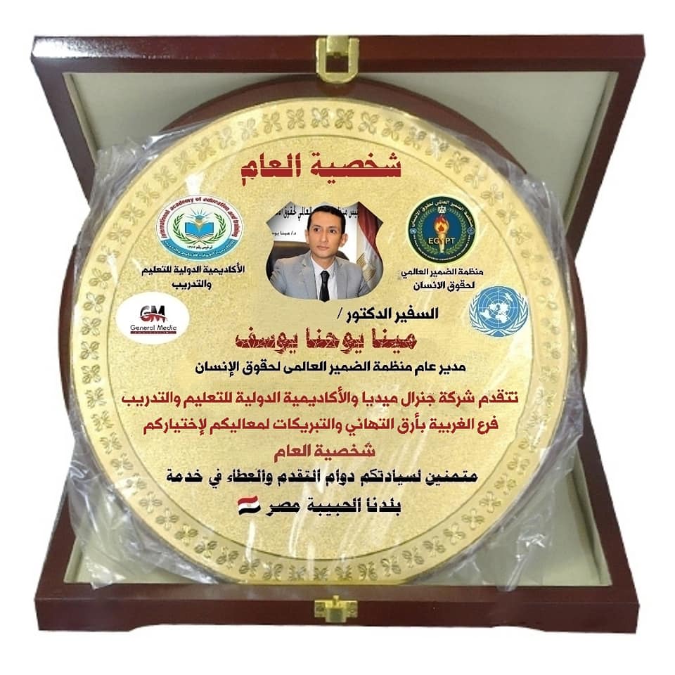 تفخر منظمة الضمير العالمي لحقوق الانسان والأكاديمية الدولية للتعليم والتدريب وشركة جنرال ميديا للدعاية والإعلان باختيار الدكتور سفير /مينا يوحنا يوسف افضل شخصية مجتمعية متميزة لهذا العام ونقدم لكم اسمي آيات الشكر والامتنان والتقدير والاحترام لما قدمتموه للوطن والمواطنين ومؤسسات الدولة وللإنسانية من أعمال جليلة يشهد لها الجميع بانها كانت عنوان حقيقي للعمل العام والخدمي والتنموي والحقوقي الذي يعد نموذج يحتذي به لبناء الأوطان.
