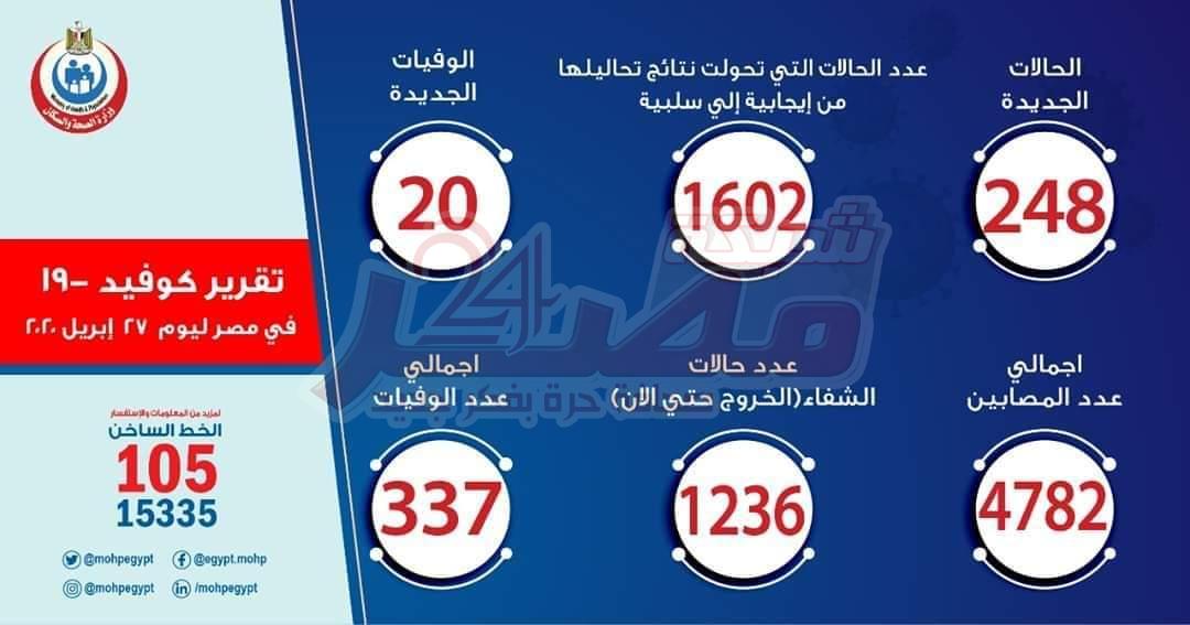 وذكر "مجاهد" أن إجمالي العدد الذي تم تسجيله في مصر بفيروس كورونا المستجد حتى اليوم الاثنين، هو 4782 حالة من ضمنهم 1236 حالة تم شفاؤها وخرجت من مستشفيات العزل والحجر الصحي، و 337 حالة وفاة.
