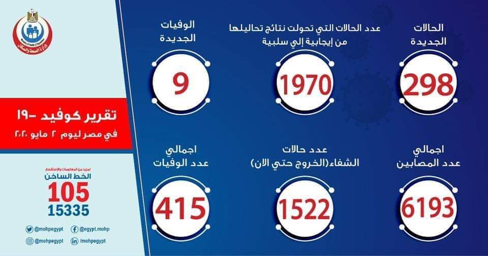 وذكر "مجاهد" أن إجمالي العدد الذي تم تسجيله في مصر بفيروس كورونا المستجد حتى اليوم، السبت، هو 6193 حالة من ضمنهم 1522 حالة تم شفاؤها وخرجت من مستشفيات العزل والحجر الصحي، و 415 حالة وفاة.