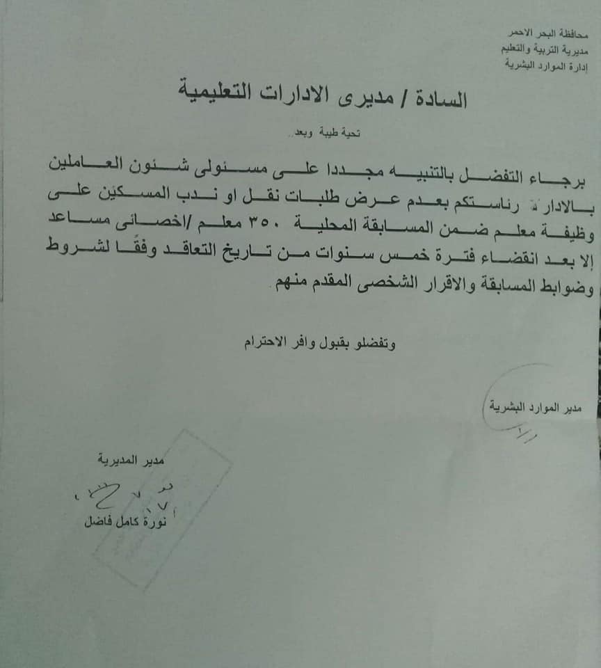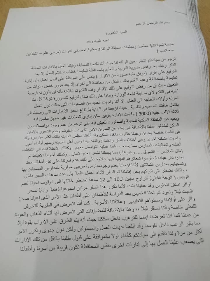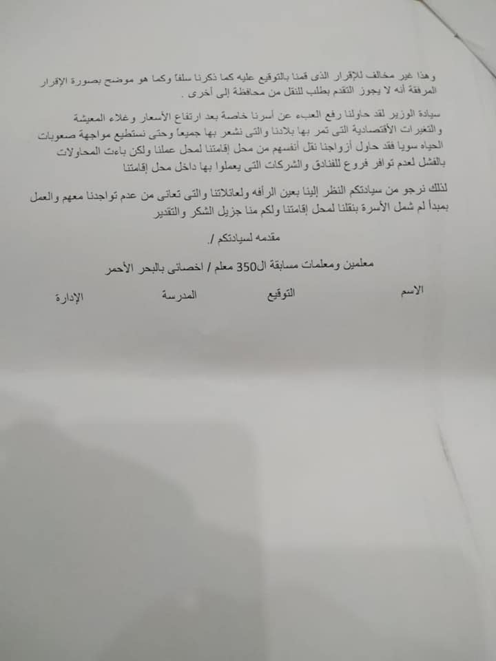 يناشد المعلمين بالبحر الاحمر وزير التربية والتعليم النظر بعين الرفه لنا حيث اننا تقدمواللمسابقه وقبلوا العمل بالادارات السابقه الذكر وذلك بعد رفض مديرية التربيه و التعليم بالمحافظه تسليمهم خطاب إستلام العمل إلا بعد التوقيع علي إقرار( مرفق صوره من الإقرار) ينص علي الموافقه علي قبول العمل بأي إداره تعليميه بالمحافظه و عدم التقدم بطلب للنقل من محافظه إلى اخري إلا بعد مرور خمس سنوات من التعيين حيث ان من رفض التوقيع على ذلك الإقرار وقت التقدم تم إبلاغه بانه لن يكون له فرصه فى التقدم لأى مسابقه تابعه للوزاره و بناءا علي ذلك قاموا بالتوقيع للضروره تاركين كل منا أسرته وأولاده للحاجه الى العمل , الا أننهم واجهوا صعوبات حالت دون العمل بكامل طاقتنا الصحيه والنفسيه. حيث فوجئوا في البدايه بارتفاع اسعار الإيجارات التي وصلت الي٣٠٠٠ج وقامت الإدارة بتوفير سكن إدارى للمعلمات غير مجهز للسكن فيه و بعيد عن المنطقه السكنيه للمدينه واضطررواللعيش فيه علي الرغم من عدم وجود مواصلات من السكن لمناطق عملنا.بالاضافه إلي بعده عن العمران الأمر الذي دب الخوف والشعور بعدم الأمان وخاصه بعد أن وجدنا عقارب داخل السكن وقد أبلغوا مجلس المدينه بذلك اكثر من مرة, وقد واجهوامشكله اخرى وهي اختلاف الفكر والطباع و اللغه بيننا وبين أهل المدينه ومنهم أولياء أمور الطلبة والطالبات بالمدارس مما يصعب التعامل معهم . وكذلك الاختلافات في الثقافات (مثل الملابس – التسوق) مما يجعلهم يشعرو بعدم الأمان .وكذلك اخواتنا الأقباط لم يجدوا دار عباده ليمارسوا شعائرهم الدينيه فيها علاوة علي ذلك عدم قدرتهم علي نقل اطفالنا معنا وتسجيلهم بمدارس الشلاتين لأننا فوجئوا بعدم وجود مدارس تجريبي موازيه للمدارس المسجلين بها ؛ولذلك نضطر لتركهم بمحل اقامتنا ثم السفر لأداء العمل علما بأن عدد ساعات السفر داخل اتوبيس الوجه القبلي "اتوبيس الصعيد"من١٠ الي١٢ساعه نضطر خلالها الوقوف احيانا لعدم توافر أماكن للجلوس وقد عانينا بشده لأننا نكرر هذا السفر مرتين أسبوعيا ذهابا وايابا نسافر السبت ليلا ونعود الخميس بعد الدراسه للاطمئنان علي اطفالناهذا الأمر الذي اعيانا صحيا . كما أننا نتعرض في الطريق للتحرش اللفظي خاصة واننا نسافر ليلا،، وهذا غير المضايقات التي نتعرض لها اثناء الذهاب و العوده من عملنا كما أننا تعرضنا ايضا للترهيب داخل سكننا حيث يتم الطرق علي الابواب بقوة ليلا ممايثر الرعب لدينا وقد أبلغنا جهات العمل و المسؤولين عن السكن اكثر من مرة بذلك الأمر ولذا فقد طلبنا النقل من تلك الإدارات التي يصعب علينا العمل فيها إلي إدارات أخري بنفس المحافظه تكون قريبه من أسرنا وأطفالنا و هذا غير مخالف للإقرار الذى وقعنا عليه كما ذكرنا سلفا و كما هو موضح بصورة الإقرار المرفقه أنه لا يجوز التقدم بطلب للنقل إلى محافظه اخري.