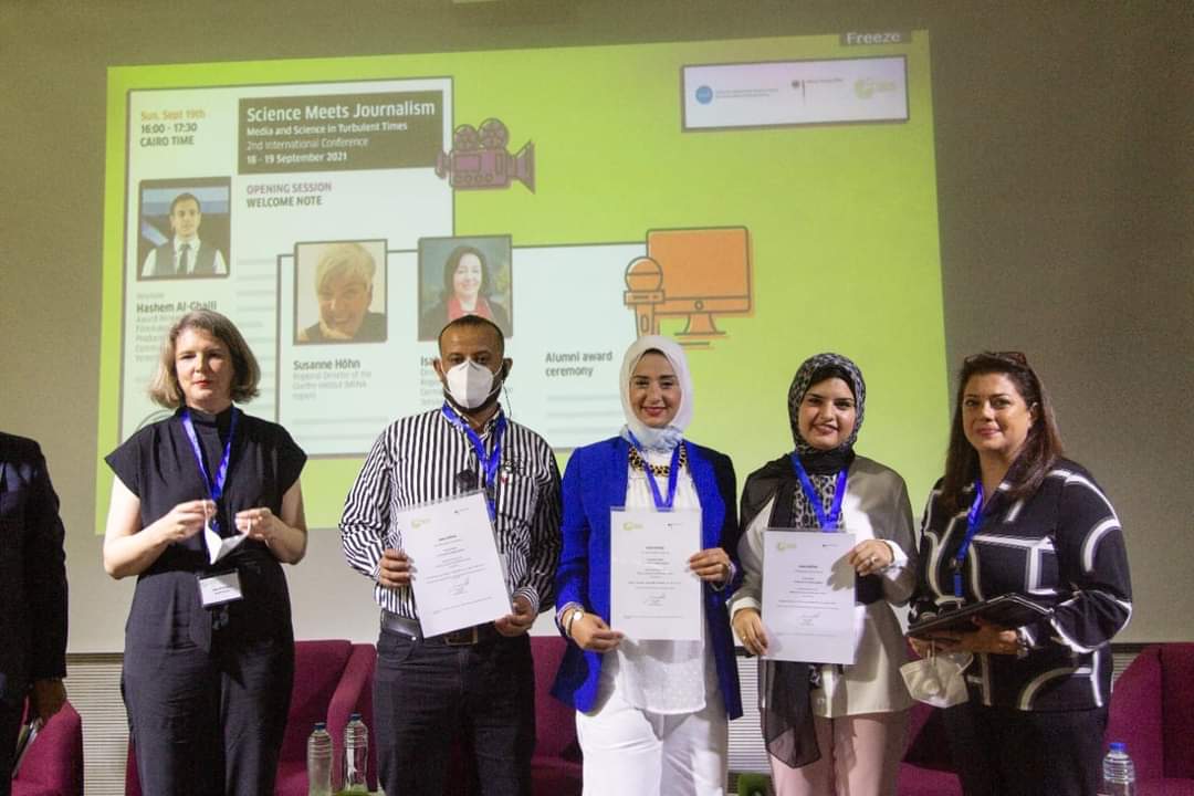 وفي ختام الجلسة الافتتاحية قامت آن ايبيرهار – مديرة قسم البرامج الثقافية في معهد جوته القاهرة والمسؤولة الاقليمية ، بتسليم الجوائز إلى الفائزات الفائزين في مسابقة الصحافة العلمية التي نظمها معهد جوته وتقدم لها مائة صحفي وصحفية من المنطقة بأسرها، وهم إنجي الطوخي وسمر أشرف من مصر ، وبسام القاضي من اليمن ، وعثمان عبد الحليم من السودان.